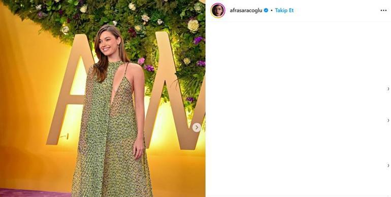 Pek kırmızı halıya uygun bulmadım ama tek başına kostüm oldukça zarif ve modern bir tasarıma sahip. Hafif şeffaf yapısıyla iddialı, yeşil tonları doğayla bağlantılı ve tazelik hissi veriyor. Uzun ve akıcı kesimi elbiseye zarafet katarken, çiçek arka planıyla uyumlu bir bütünlük oluşturmuş. Derin yaka detayı ve asimetrik tasarımı cesur bir tercih olarak dikkat çekiyor. Genel olarak, kırmızı halı veya özel bir etkinlik için çarpıcı ve özgün bir seçim, ama Afra’nın tarzı olmadığını düşünüyorum.